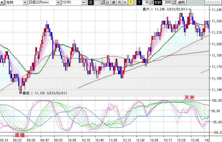 2013/02/01 - tensokoさんの株式ブログ。タイトル:「★2/1 日中の株価の天底★」 本文:★2/1 日中の株価の天底★ ↓クリックで画像拡大↓ ※指標ラインの密集点が天底・転換点を示します。指標の見方日経225mini先物チャート : 96ティック足底値 : 11135 (2/1