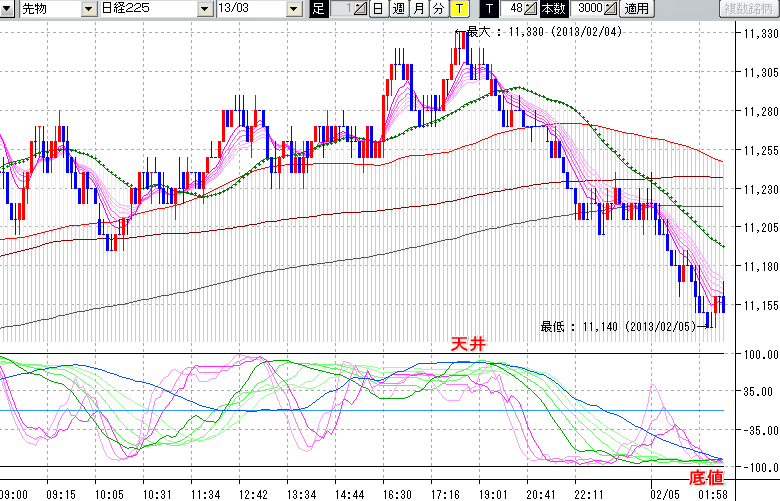2013/02/05 - tensokoさんの株式ブログ。タイトル:「★2/5 夜間の株価の天底★」 本文:★2/5 夜間の株価の天底★ ↓クリックで画像拡大↓ ※指標ラインの密集点が天底・転換点を示します。指標の見方日経225large先物チャート : 48ティック足天井 : 11330 (2/4
