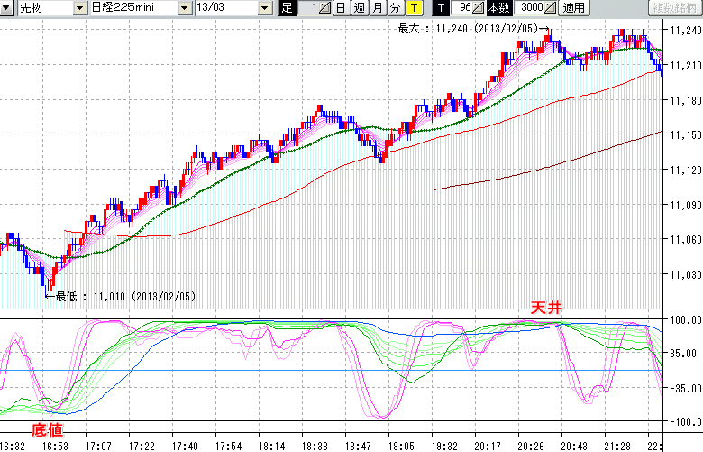 2013/02/06 - tensokoさんの株式ブログ。タイトル:「★2/5 夜間の株価の天底★」 本文:★2/5 夜間の株価の天底★ ↓クリックで画像拡大↓ ※指標ラインの密集点が天底・転換点を示します。指標の見方日経225mini先物チャート : 96ティック足底値 : 11010 (2/5