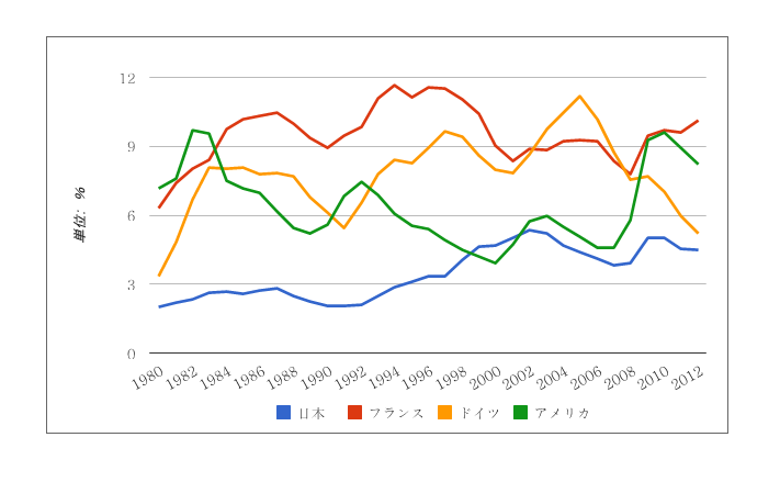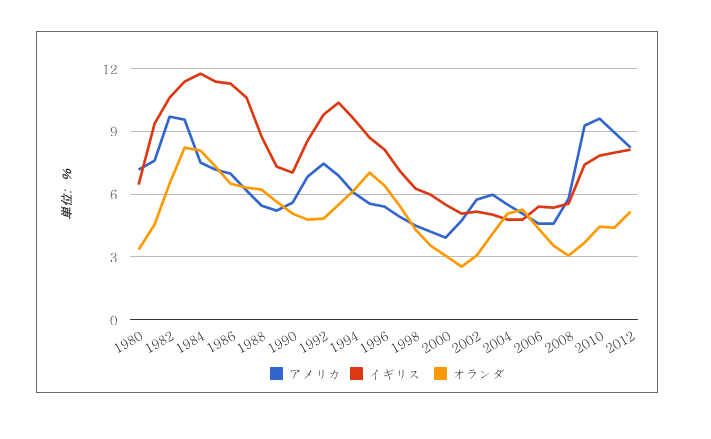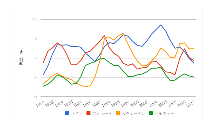 各国失業率推移の比較(一番左の図、二番目はアングロサクソン3国、三番目は北部欧州)です。