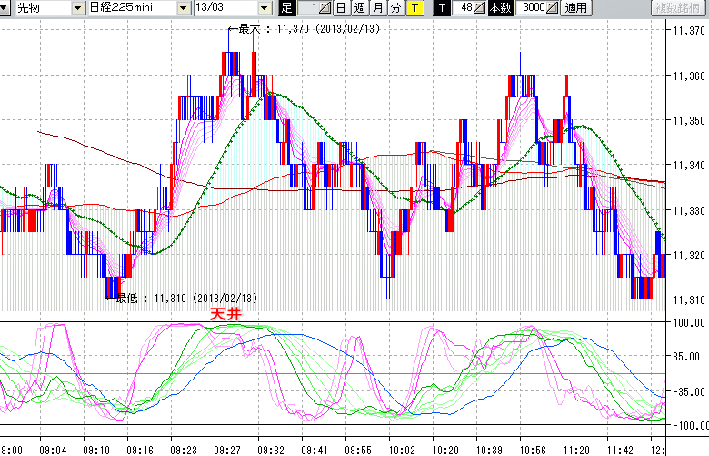 2013/02/13 - tensokoさんの株式ブログ。タイトル:「★2/13 日中の株価の天底★」 本文:★2/13 日中の株価の天底★ ↓クリックで画像拡大↓ ↓クリックで画像拡大↓ ※指標ラインの密集点が天底・転換点を示します。指標の見方日経225mini先物チャート(上) :