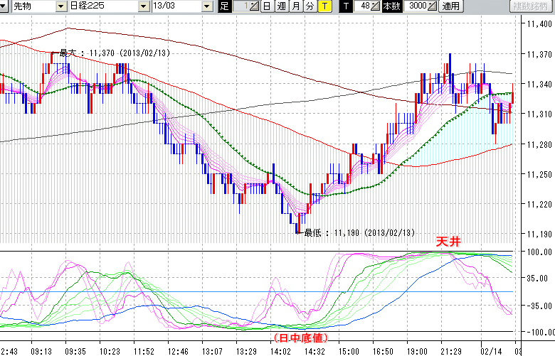 2013/02/14 - tensokoさんの株式ブログ。タイトル:「★2/13 夜間の株価の天井★」 本文:★2/13 夜間の株価の天井★ ↓クリックで画像拡大↓ ※指標ラインの密集点が天底・転換点を示します。指標の見方日経225large先物チャート : 48ティック足天井 : 11370 (2/13