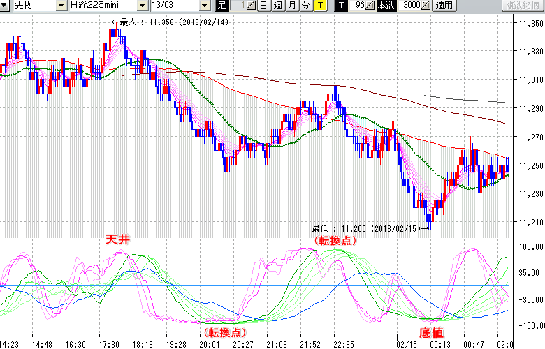 2013/02/15 - tensokoさんの株式ブログ。タイトル:「★2/14 夜間の株価の天底★」 本文:★2/14 夜間の株価の天底★ ↓クリックで画像拡大↓ ※指標ラインの密集点が天底・転換点を示します。指標の見方日経225mini先物チャート : 96ティック足天井 : 11350 (2/14