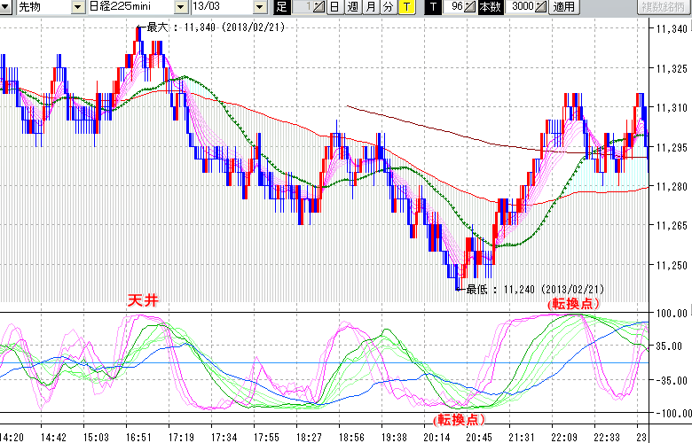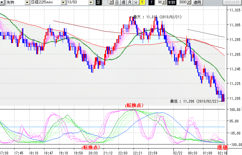 2013/02/22 - tensokoさんの株式ブログ。タイトル:「★2/21 夜間の株価の天底★」 本文:★2/21 夜間の株価の天底★ ↓クリックで画像拡大↓ ↓クリックで画像拡大↓ ※指標ラインの密集点が天底・転換点を示します。指標の見方日経225mini先物チャート(上) :