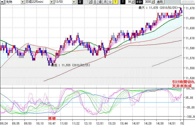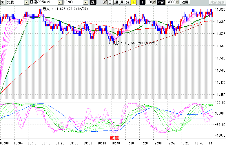2013/02/25 - tensokoさんの株式ブログ。タイトル:「★2/25 日中の株価の天底★」 本文:★2/25 日中の株価の天底★ ↓クリックで画像拡大↓ ↓クリックで画像拡大↓ ※指標ラインの密集点が天底・転換点を示します。指標の見方日経225mini先物チャート(上) :