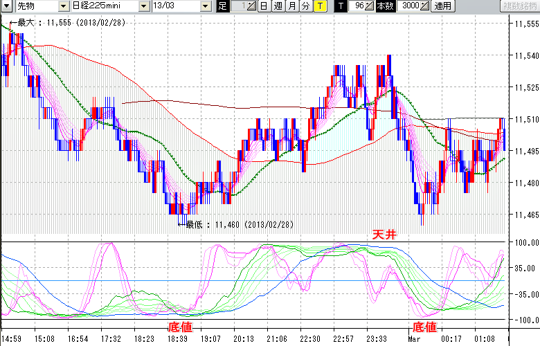 2013/03/01 - tensokoさんの株式ブログ。タイトル:「★2/28 夜間の株価の天底★」 本文:★2/28 夜間の株価の天底★ ↓クリックで画像拡大↓ ※指標ラインの密集点が天底・転換点を示します。指標の見方日経225mini先物チャート : 96ティック足底値 : 11460 (2/28