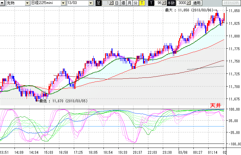 2013/03/06 - tensokoさんの株式ブログ。タイトル:「★3/5 夜間の株価の天井★」 本文:★3/5 夜間の株価の天井★ ↓クリックで画像拡大↓ ※指標ラインの密集点が天底・転換点を示します。指標の見方日経225mini先物チャート : 96ティック足天井 : 11850 (3/6
