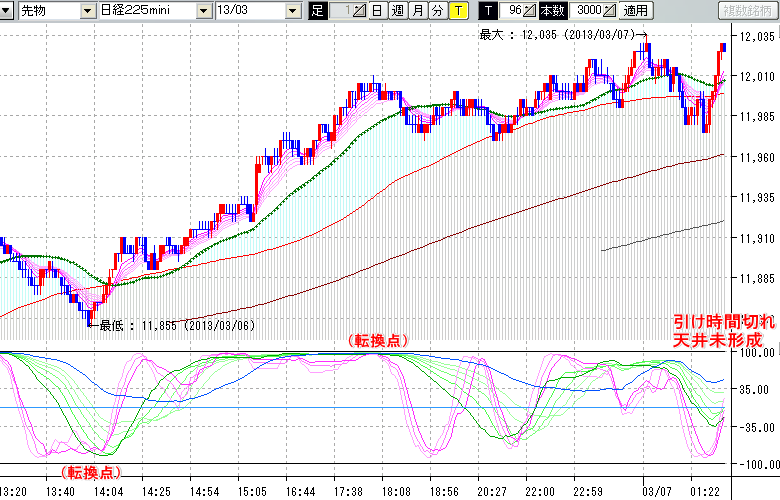 2013/03/07 - tensokoさんの株式ブログ。タイトル:「★3/6 夜間の株価の天井★」 本文:★3/6 夜間の株価の天井★ ↓クリックで画像拡大↓ ※指標ラインの密集点が天底・転換点を示します。指標の見方日経225mini先物チャート : 96ティック足天井 :