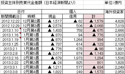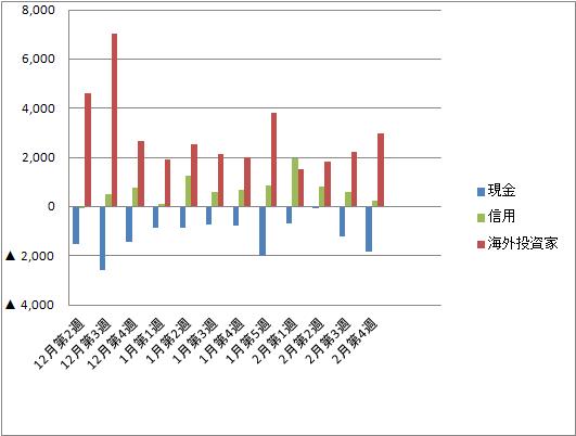 2013/03/09 - 正坊さんの株式ブログ。タイトル:「投資主体別売買代金差額(2月第4週)」 本文:金曜日の日経新聞に載っていた投資主体別売買代金差額を、年末からグラフにしたものです。