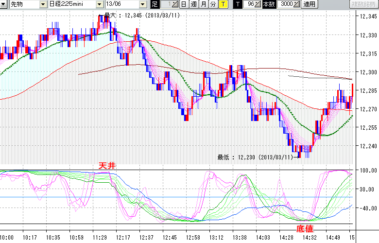 2013/03/11 - tensokoさんの株式ブログ。タイトル:「★3/11 日中の株価の天底★」 本文:★3/11 日中の株価の天底★ ↓クリックで画像拡大↓ ※指標ラインの密集点が天底・転換点を示します。指標の見方日経225mini先物チャート : 96ティック足天井 : 12345 (3/11