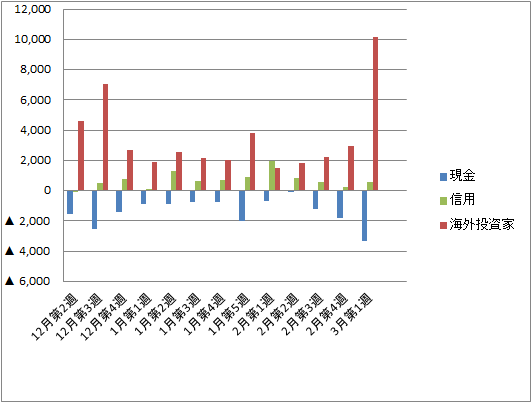 2013/03/15 - 正坊さんの株式ブログ。タイトル:「投資主体別売買代金差額(3月第1週)」 本文:海外投資家の買い越し1兆円ということで新聞記事にもなってますが、いや~~確かにスゴいです。これだとよほどババつかみをしなければ、それこそ猿でももうけられそう。とか言いながら、自分はチキンな方なので買い