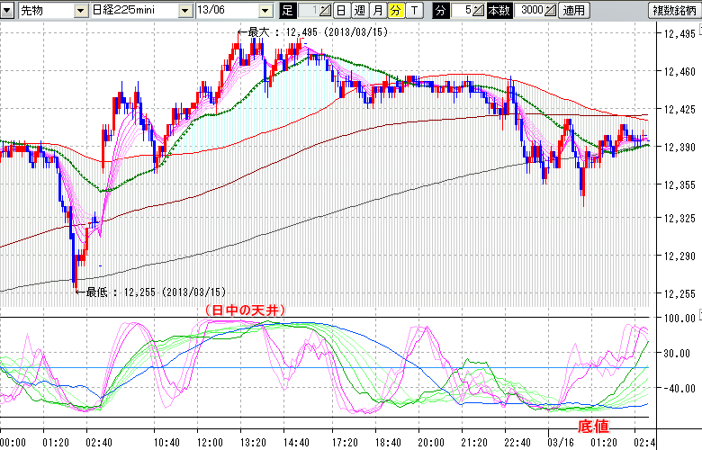 2013/03/16 - tensokoさんの株式ブログ。タイトル:「★3/15 夜間の株価の底値★」 本文:★3/15 夜間の株価の底値★ ↓クリックで画像拡大↓ ※指標ラインの密集点が天底・転換点を示します。指標の見方日経225mini先物チャート : 5分足底値 : 12335 (3/16