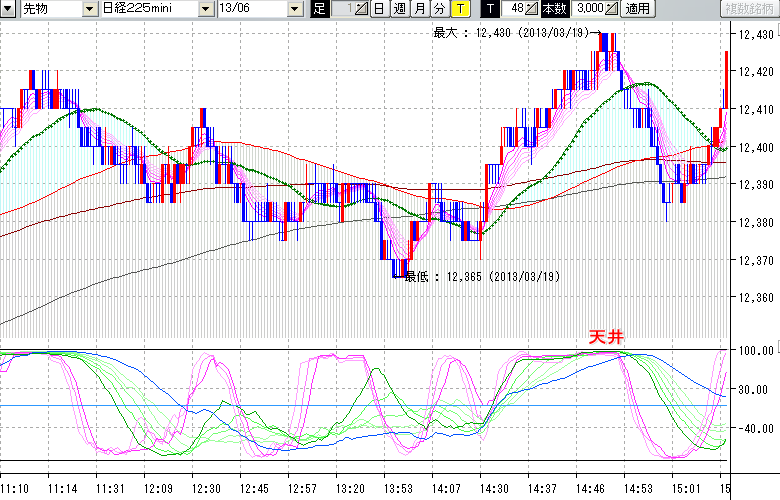 2013/03/19 - tensokoさんの株式ブログ。タイトル:「★3/19 日中の株価の天井★」 本文:★3/19 日中の株価の天井★ ↓クリックで画像拡大↓ ※指標ラインの密集点が天底・転換点を示します。指標の見方日経225mini先物チャート : 48ティック足天井 : 12430 (3/19