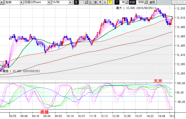 2013/03/25 - tensokoさんの株式ブログ。タイトル:「★3/25 日中の株価の天底★」 本文:★3/25 日中の株価の天底★ ↓クリックで画像拡大↓ ※指標ラインの密集点が天底・転換点を示します。指標の見方日経225mini先物チャート : 96ティック足底値 : 12410 (3/25
