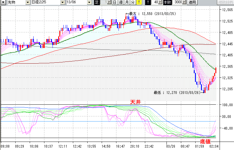 2013/03/26 - tensokoさんの株式ブログ。タイトル:「★3/25 夜間の株価の天底★」 本文:★3/25 夜間の株価の天底★ ↓クリックで画像拡大↓ ※指標ラインの密集点が天底・転換点を示します。指標の見方日経225large先物チャート : 48ティック足天井 : 12550 (3/25