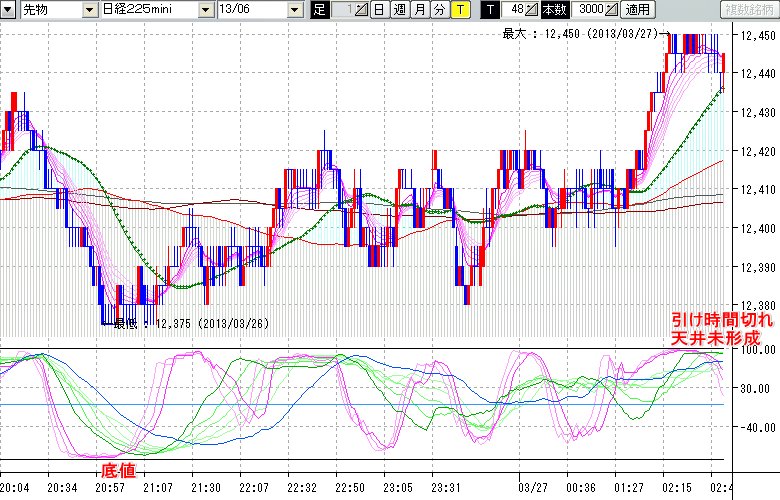 2013/03/27 - tensokoさんの株式ブログ。タイトル:「★3/26 夜間の株価の天底★」 本文:★3/26 夜間の株価の天底★ ↓クリックで画像拡大↓ ※指標ラインの密集点が天底・転換点を示します。指標の見方日経225mini先物チャート : 48ティック足底値 : 12375 (3/26