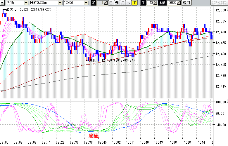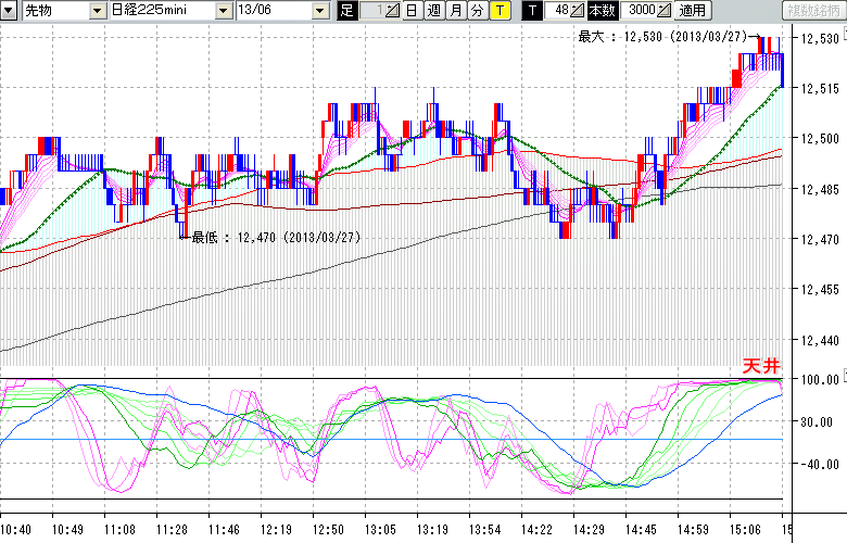 2013/03/27 - tensokoさんの株式ブログ。タイトル:「★3/27 日中の株価の天底★」 本文:★3/27 日中の株価の天底★ ↓クリックで画像拡大↓ ↓クリックで画像拡大↓ ※指標ラインの密集点が天底・転換点を示します。指標の見方日経225mini先物チャート(上) :