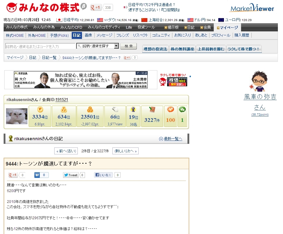 2013/03/28 - rikakusenninさんの株式ブログ。タイトル:「♥ kai波動さんが風車の弥吉さんを・・・・^^;」 本文:抱き込んでます・・・・・ →Orz/// 私の先日の日記 「 9444:トーシンが騰進・・・ 」 に♥ kai波動みんなのライジングベル♪*⌒❀⌒*✿‿✿◆#☆さん