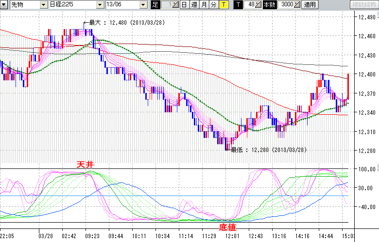 2013/03/28 - tensokoさんの株式ブログ。タイトル:「★3/28 日中の株価の天底★」 本文:★3/28 日中の株価の天底★ ↓クリックで画像拡大↓ ※指標ラインの密集点が天底・転換点を示します。指標の見方日経225large先物チャート : 48ティック足天井 : 12480 (3/28