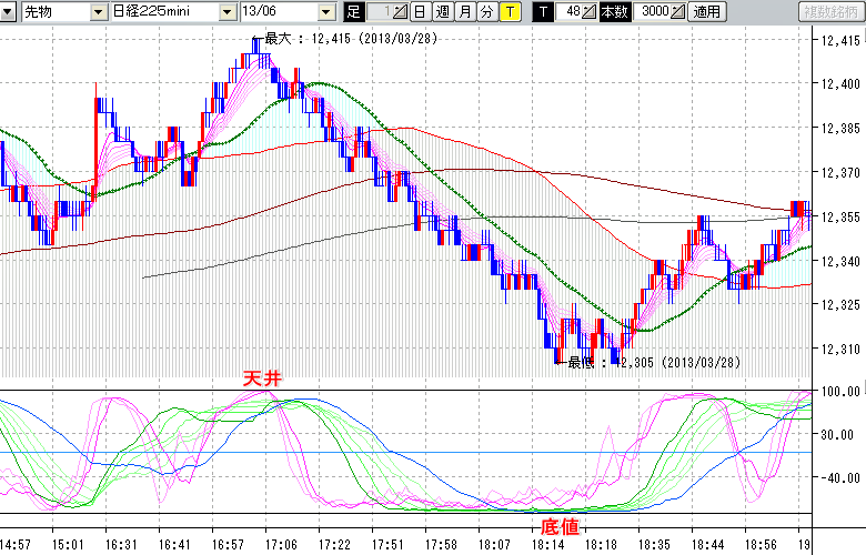 2013/03/29 - tensokoさんの株式ブログ。タイトル:「★3/29 日中の株価の天底★」 本文:★3/29 日中の株価の天底★ ↓クリックで画像拡大↓ ※指標ラインの密集点が天底・転換点を示します。指標の見方日経225mini先物チャート : 48ティック足底値 : 12330 (3/29