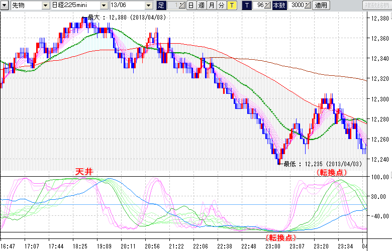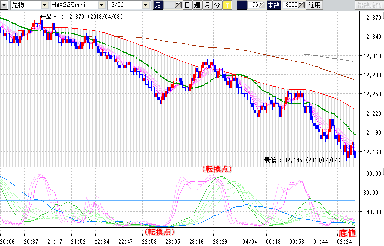 2013/04/04 - tensokoさんの株式ブログ。タイトル:「★4/3 夜間の株価の天底★」 本文:★4/3 夜間の株価の天底★ ↓クリックで画像拡大↓ ↓クリックで画像拡大↓ ※指標ラインの密集点が天底・転換点を示します。指標の見方日経225mini先物チャート(上) :