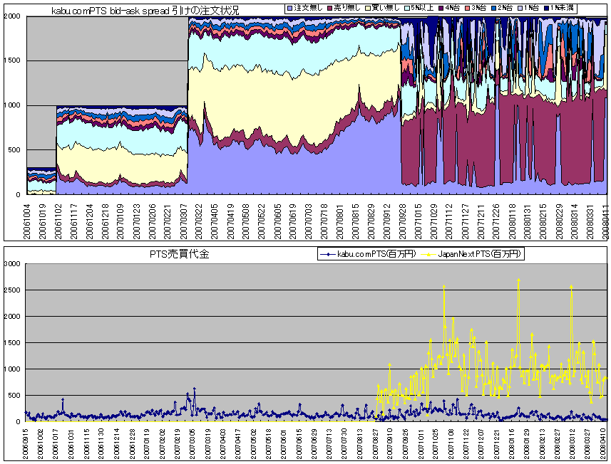 2008/04/12 - miyakenさんの株式ブログ。タイトル:「kabu.comPTS ~2008/04/11 」 本文:kabu.comPTSの引けの注文状況と、売買代金のグラフです。 JapanNextPTSの売買代金は、推計値です。公式のものではありません。
