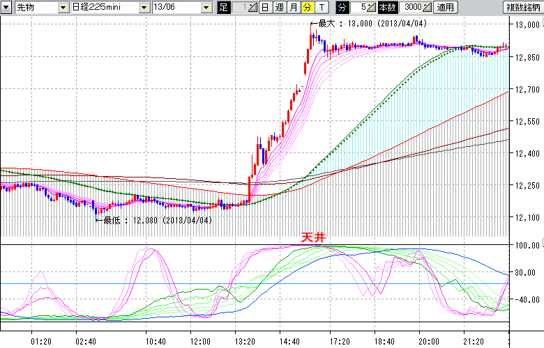 2013/04/05 - tensokoさんの株式ブログ。タイトル:「★4/4 夜間の株価の天井★」 本文:★4/4 夜間の株価の天井★ ↓クリックで画像拡大↓ ※指標ラインの密集点が天底・転換点を示します。指標の見方日経225mini先物チャート : 5分足天井 : 13000 (4/4