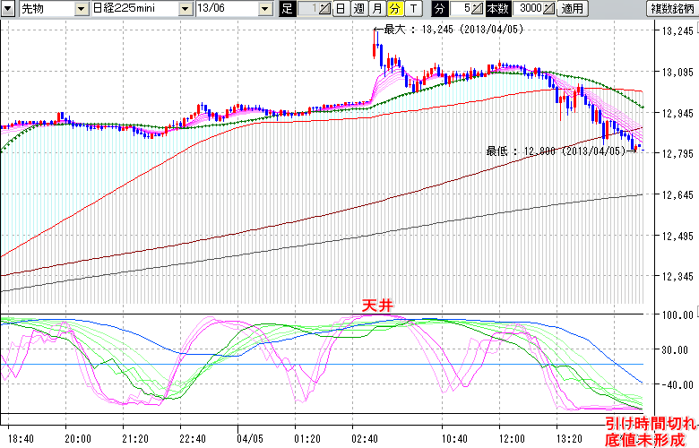 2013/04/05 - tensokoさんの株式ブログ。タイトル:「★4/5 日中の株価の天底★」 本文:★4/5 日中の株価の天底★ ↓クリックで画像拡大↓ ※指標ラインの密集点が天底・転換点を示します。指標の見方日経225mini先物チャート : 5分足天井 : 13245 (4/5