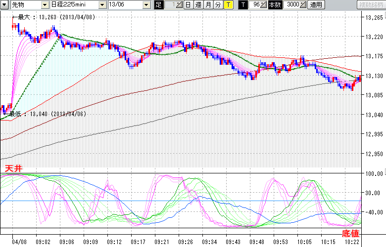 2013/04/08 - tensokoさんの株式ブログ。タイトル:「★4/8 日中の株価の天底★」 本文:★4/8 日中の株価の天底★ ↓クリックで画像拡大↓ ※指標ラインの密集点が天底・転換点を示します。指標の見方日経225mini先物チャート : 96ティック足天井 : 13265 (4/8