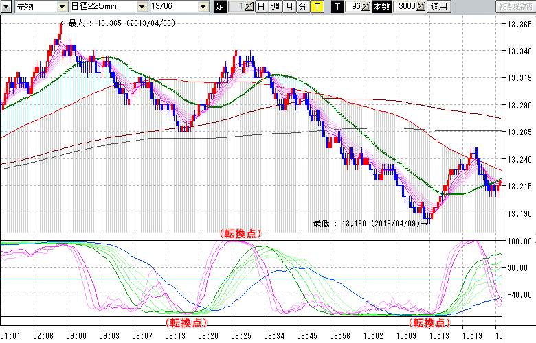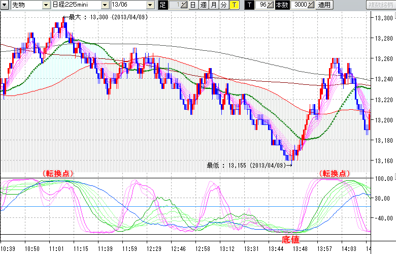 2013/04/09 - tensokoさんの株式ブログ。タイトル:「★4/9 日中の株価の転換点・底値★」 本文:★4/9 日中の株価の転換点・底値★ ↓クリックで画像拡大↓ ↓クリックで画像拡大↓ ※指標ラインの密集点が天底・転換点を示します。指標の見方日経225mini先物チャート(上) :