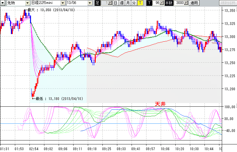 2013/04/10 - tensokoさんの株式ブログ。タイトル:「★4/10 日中の株価の天井★」 本文:★4/10 日中の株価の天井★ ↓クリックで画像拡大↓※指標ラインの密集点が天底・転換点を示します。指標の見方日経225mini先物チャート : 96ティック足天井 : 13330 (4/10