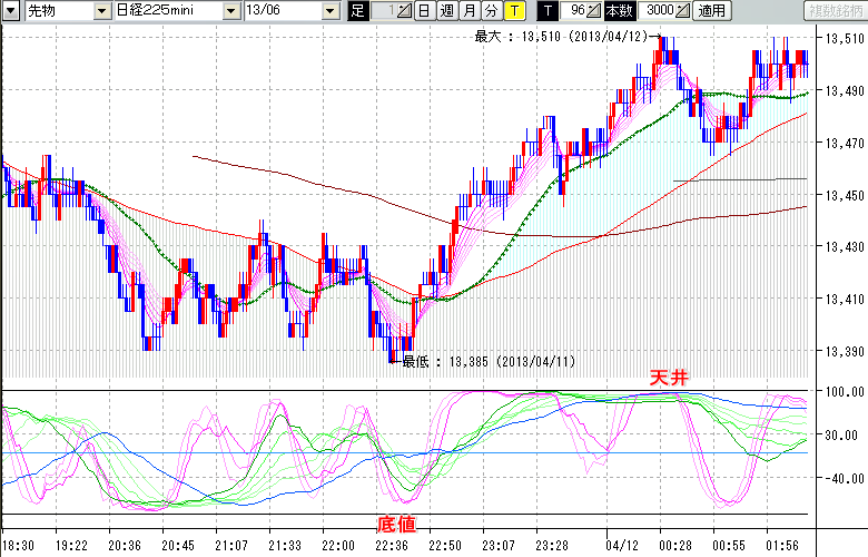 2013/04/12 - tensokoさんの株式ブログ。タイトル:「★4/11 夜間の株価の天底★」 本文:★4/11 夜間の株価の天底★ ↓クリックで画像拡大↓ ※指標ラインの密集点が天底・転換点を示します。指標の見方日経225mini先物チャート : 96ティック足底値 : 13385 (4/11
