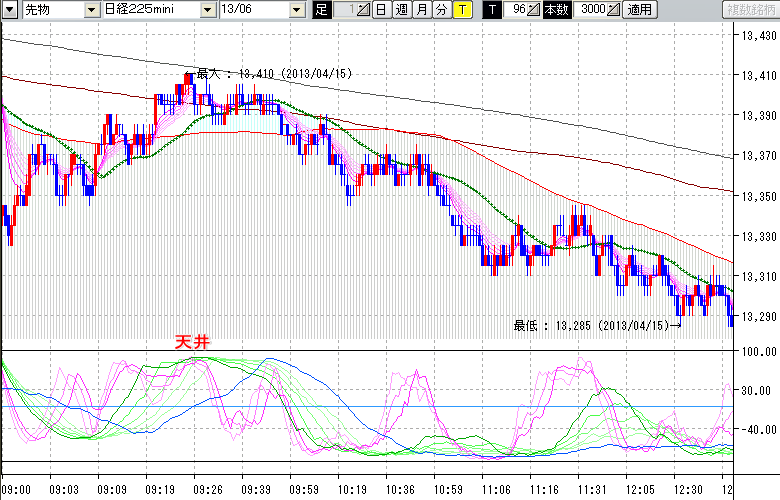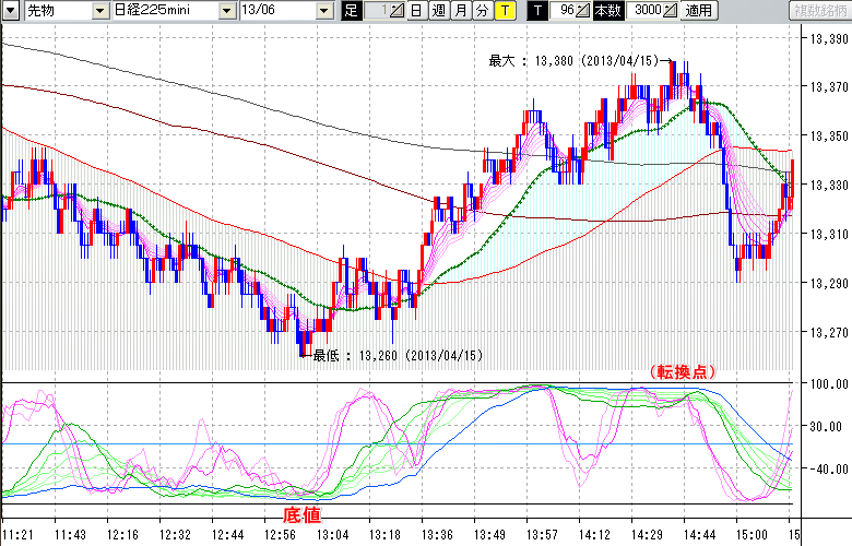 2013/04/15 - tensokoさんの株式ブログ。タイトル:「★4/15 日中の株価の天底★」 本文:★4/15 日中の株価の天底★ ↓クリックで画像拡大↓ ↓クリックで画像拡大↓ ※指標ラインの密集点が天底・転換点を示します。指標の見方日経225mini先物チャート(上) :