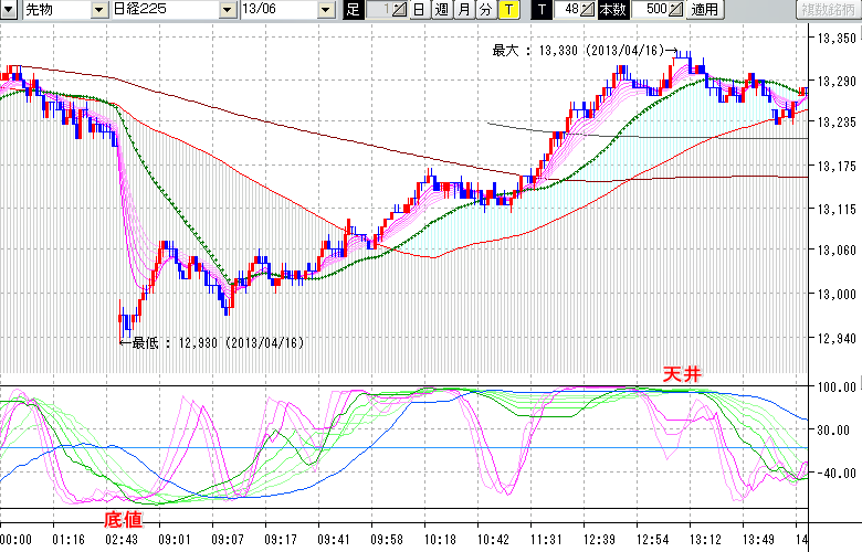 2013/04/16 - tensokoさんの株式ブログ。タイトル:「★4/16 日中の株価の天底★」 本文:★4/16 日中の株価の天底★ ↓クリックで画像拡大↓ ※指標ラインの密集点が天底・転換点を示します。指標の見方日経225large先物チャート : 48ティック足底値 : 12930 (4/16