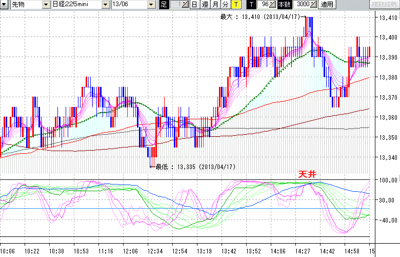 2013/04/17 - tensokoさんの株式ブログ。タイトル:「★4/17 日中の株価の天井★」 本文:★4/17 日中の株価の天井★ ↓クリックで画像拡大↓ ※指標ラインの密集点が天底・転換点を示します。指標の見方日経225mini先物チャート : 96ティック足天井 : 13410 (4/17