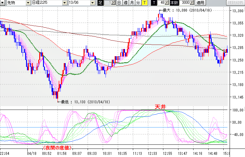 2013/04/18 - tensokoさんの株式ブログ。タイトル:「★4/18 日中の株価の天井★」 本文:★4/18 日中の株価の天井★ ↓クリックで画像拡大↓ ※指標ラインの密集点が天底・転換点を示します。指標の見方日経225large先物チャート : 48ティック足天井 : 13390 (4/18