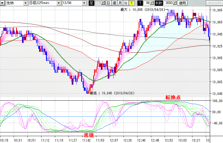 2013/04/26 - tensokoさんの株式ブログ。タイトル:「★4/26 日中の株価の底値・転換点★」 本文: ↓クリックで画像拡大↓ ※指標ラインの密集点が天底・転換点を示します。指標の見方日経225mini先物チャート : 96ティック足底値 : 13845 (4/26 11:44頃)転換点: