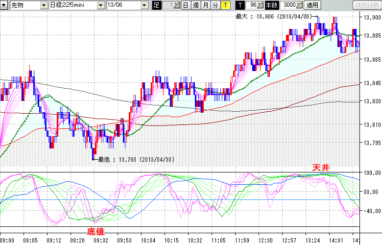 2013/04/30 - tensokoさんの株式ブログ。タイトル:「★4/30 日中の株価の天底★」 本文:★4/30 日中の株価の天底★ ↓クリックで画像拡大↓ ※指標ラインの密集点が天底・転換点を示します。指標の見方日経225mini先物チャート : 96ティック足底値 : 13780 (4/30