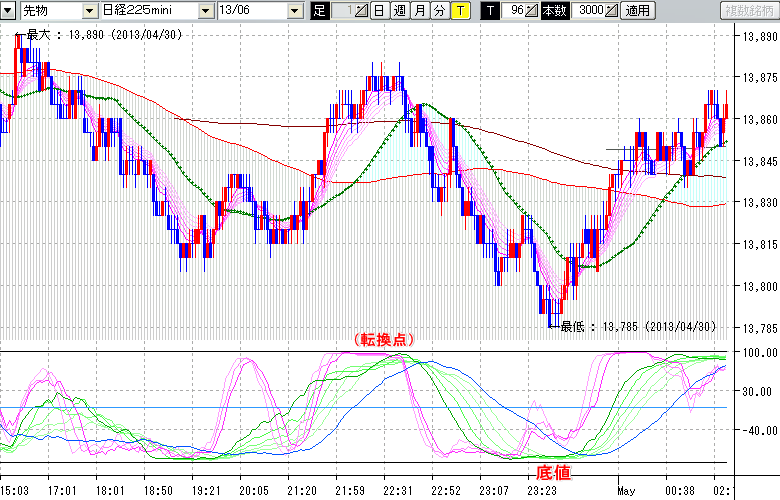 2013/05/01 - tensokoさんの株式ブログ。タイトル:「★4/30 夜間の株価の底値★」 本文:★4/30 夜間の株価の底値★ ↓クリックで画像拡大↓ ※指標ラインの密集点が天底・転換点を示します。指標の見方日経225mini先物チャート : 96ティック足底値 : 13785 (4/30