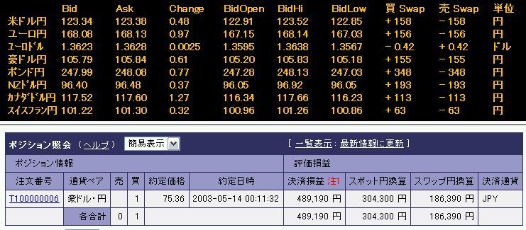 しかし、単元あたりのスワップ金利は美味しいですよね~、ですので一度利益確定して50万円を現金化して、同じ豪ドルを1単位だけ買えば