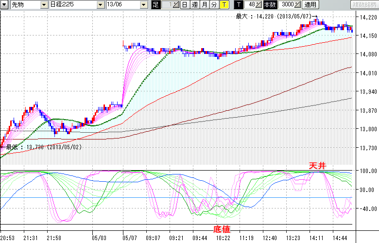 2013/05/07 - tensokoさんの株式ブログ。タイトル:「★5/7 日中の株価の天底★」 本文:★5/7 日中の株価の天底★ ↓クリックで画像拡大↓ ※指標ラインの密集点が天底・転換点を示します。指標の見方日経225large先物チャート : 48ティック足底値 : 14060 (5/7