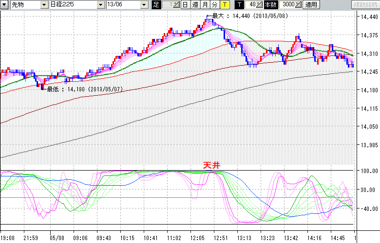 2013/05/08 - tensokoさんの株式ブログ。タイトル:「★5/8 日中の株価の天井★」 本文:★5/8 日中の株価の天井★ ↓クリックで画像拡大↓ ※指標ラインの密集点が天底・転換点を示します。指標の見方日経225large先物チャート : 48ティック足天井 : 14440 (5/8