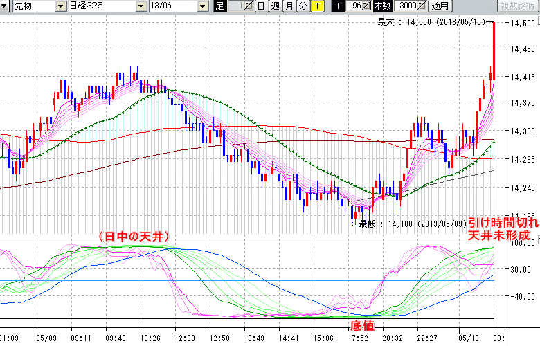 2013/05/10 - tensokoさんの株式ブログ。タイトル:「★5/9 夜間の株価の天底★」 本文:★5/9 夜間の株価の天底★ ↓クリックで画像拡大↓ ※指標ラインの密集点が天底・転換点を示します。指標の見方日経225large先物チャート : 96ティック足底値 : 14180 (5/9