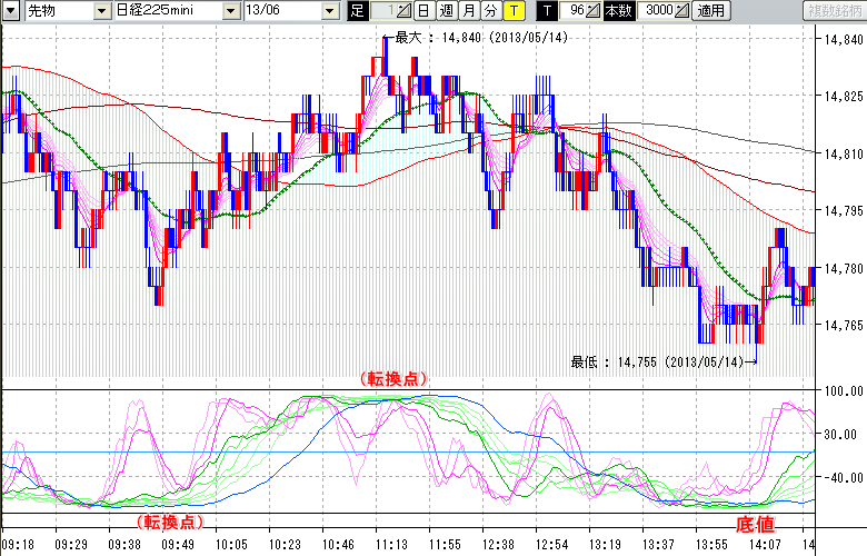 2013/05/14 - tensokoさんの株式ブログ。タイトル:「★5/14 日中の株価の底値★」 本文:★5/14 日中の株価の底値★ ↓クリックで画像拡大↓ ※指標ラインの密集点が天底・転換点を示します。指標の見方日経225mini先物チャート : 96ティック足底値 : 14755 (5/14