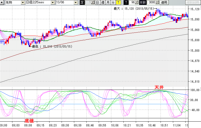 2013/05/15 - tensokoさんの株式ブログ。タイトル:「★5/15 日中の株価の天底★」 本文:★5/15 日中の株価の天底★ ↓クリックで画像拡大↓ ※指標ラインの密集点が天底・転換点を示します。指標の見方日経225mini先物チャート : 96ティック足底値 : 15010 (5/15