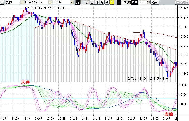 2013/05/17 - tensokoさんの株式ブログ。タイトル:「★5/16 夜間の株価の天底★」 本文:★5/16 夜間の株価の天底★ ↓クリックで画像拡大↓ ※指標ラインの密集点が天底・転換点を示します。指標の見方日経225mini先物チャート : 96ティック足天井 : 15140 (5/16