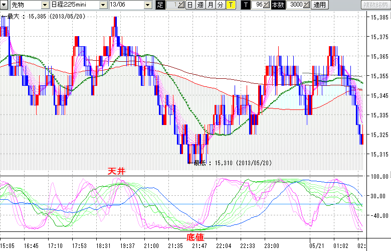 2013/05/21 - tensokoさんの株式ブログ。タイトル:「★5/20 夜間の株価の天底★」 本文:★5/20 夜間の株価の天底★ ↓クリックで画像拡大↓ ※指標ラインの密集点が天底・転換点を示します。指標の見方日経225mini先物チャート : 96ティック足天井 : 15385 (5/20