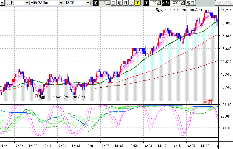 2013/05/22 - tensokoさんの株式ブログ。タイトル:「★5/22 日中の株価の天井★」 本文:★5/22 日中の株価の天井★ ↓クリックで画像拡大↓ ※指標ラインの密集点が天底・転換点を示します。指標の見方日経225mini先物チャート : 96ティック足天井 : 15715 (5/22