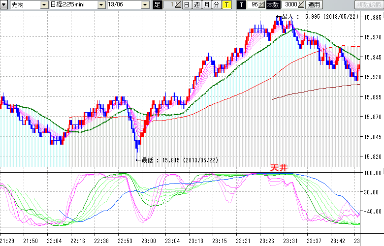2013/05/23 - tensokoさんの株式ブログ。タイトル:「★5/22 夜間の株価の天井★」 本文:★5/22 夜間の株価の天井★ ↓クリックで画像拡大↓ ※指標ラインの密集点が天底・転換点を示します。指標の見方日経225mini先物チャート : 96ティック足天井 : 15995 (5/22