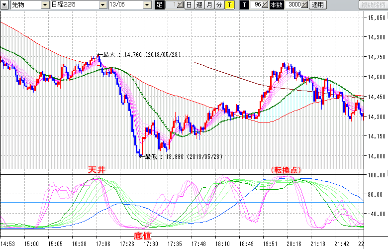 2013/05/24 - tensokoさんの株式ブログ。タイトル:「★5/23 夜間の株価の天底★」 本文:★5/23 夜間の株価の天底★ ↓クリックで画像拡大↓ ※指標ラインの密集点が天底・転換点を示します。指標の見方日経225large先物チャート : 96ティック足天井 : 14760 (5/23